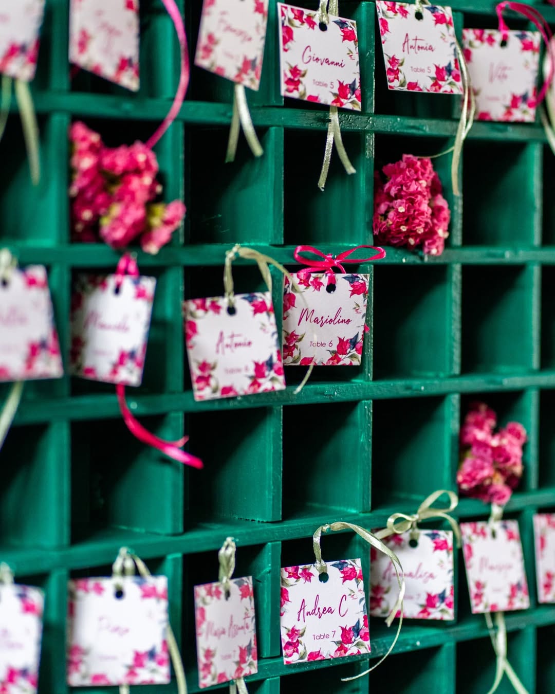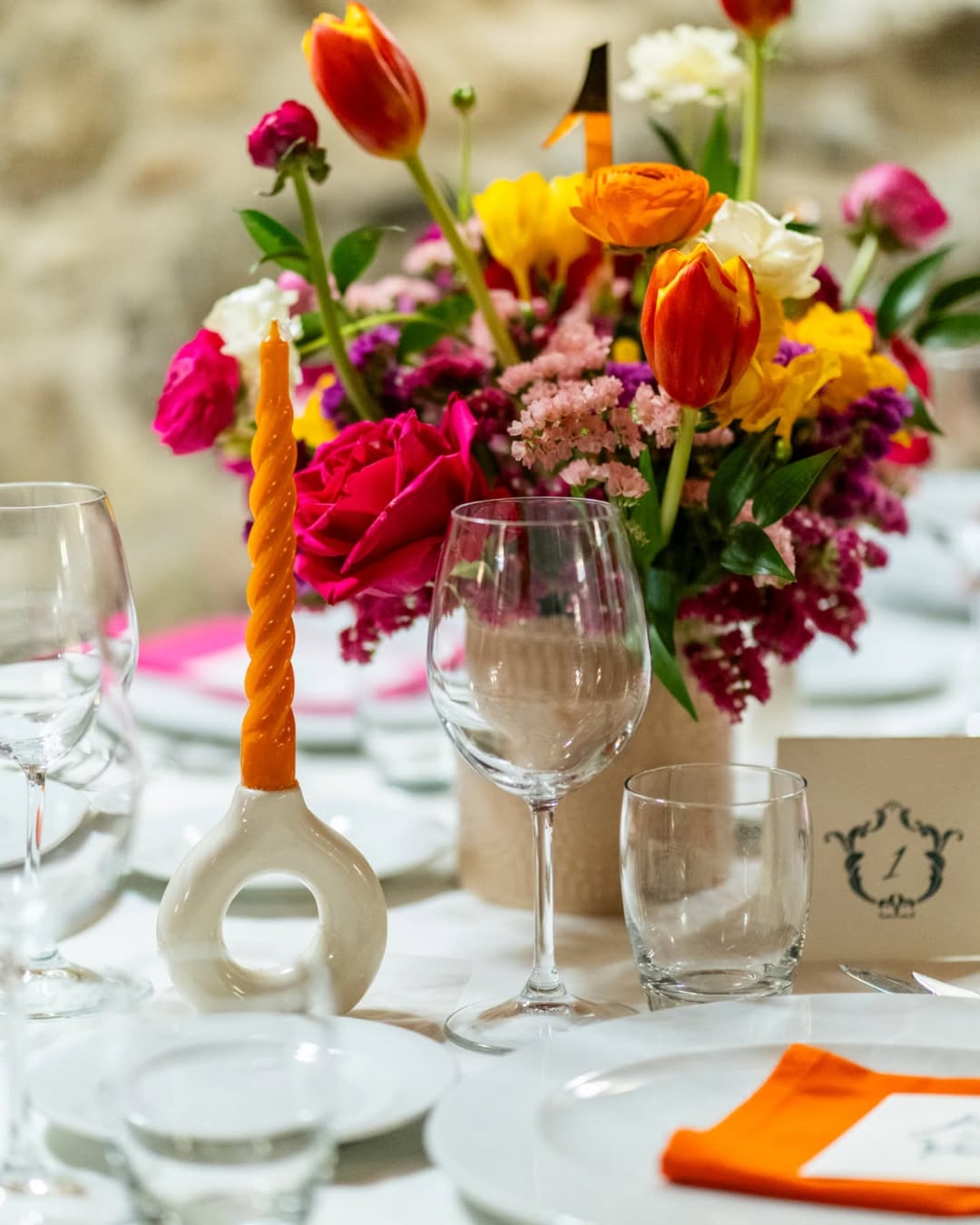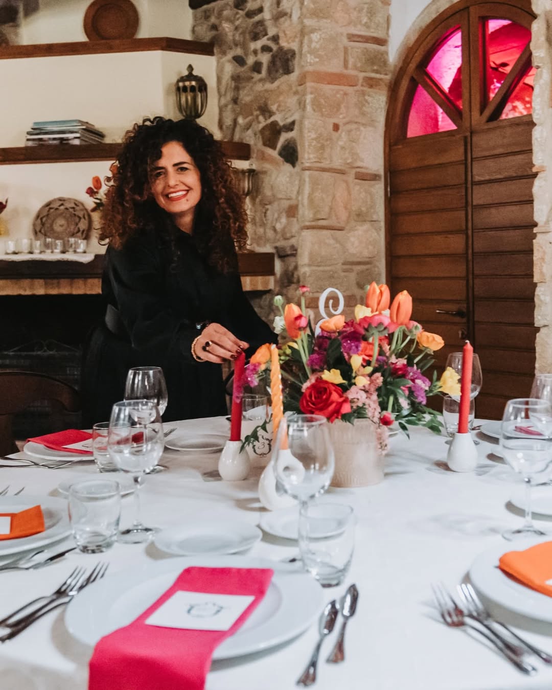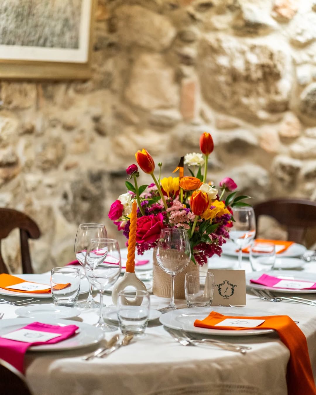 Profumo di primavera per festeggiare Bianca. Verve e tanto carattere contraddistinguono questo party. Colori decisi, profumi inebrianti e tanto charme. Un mix perfetto per raccontare la personalità della festeggiata e dare un’impronta indelebile all’evento. Un evento dove il colore è il protagonista, in un gioco di luci e colori che trasforma la location. Luci nei toni del fucsia per avvolgere le arcate in pietra del portico per una versione più accattivante e calda dell’ambiente. Centrotavola che inneggiano alla primavera con fiori dai colori sgargianti e festosi. Il tableau, una bacheca color ottanio, per contenere card nominative abbellite anch’esse da fiori stilizzati. Un party frizzante curato nei minimi dettagli come solo Mai dire Mai sa fare.