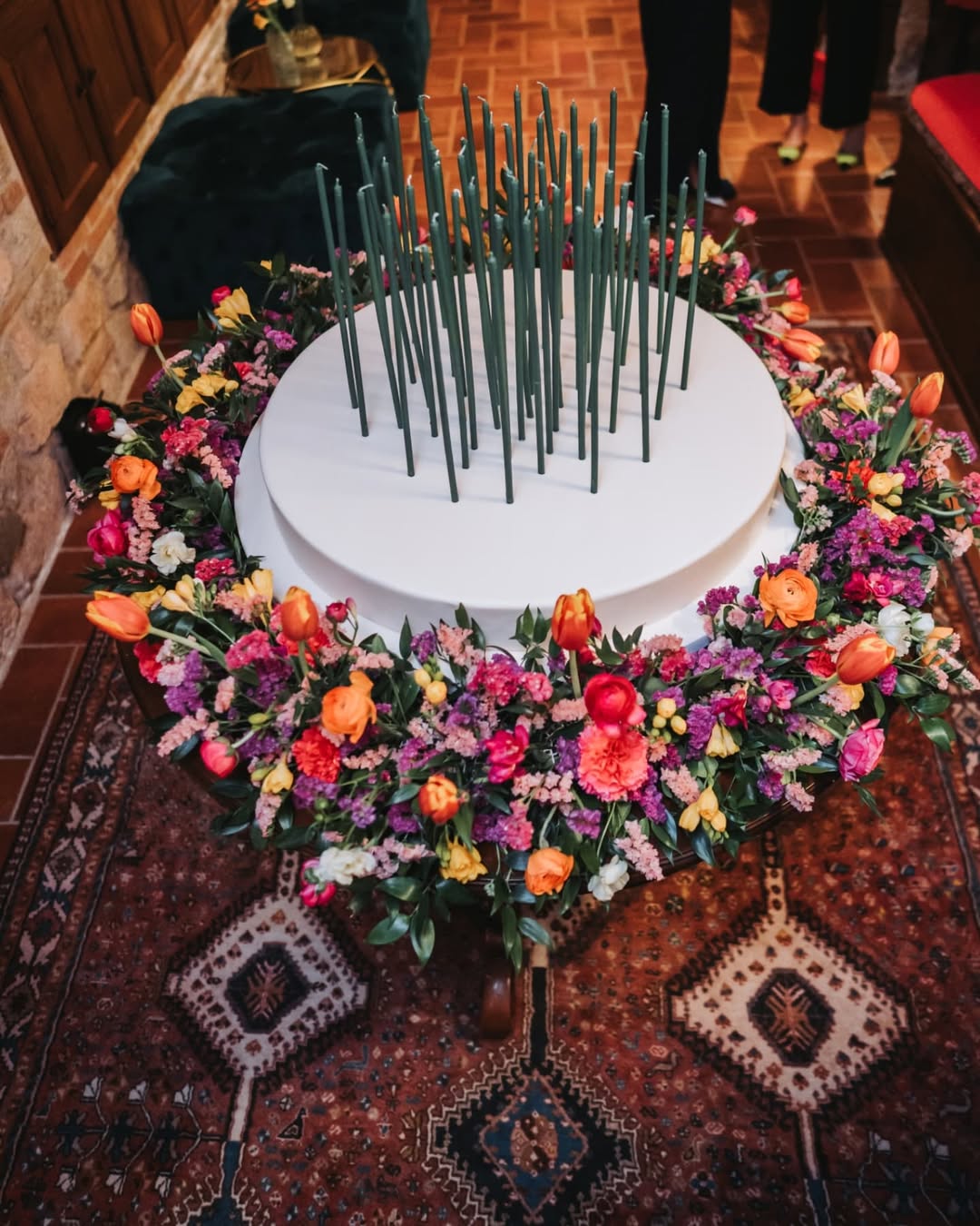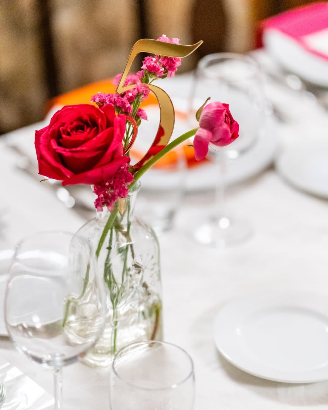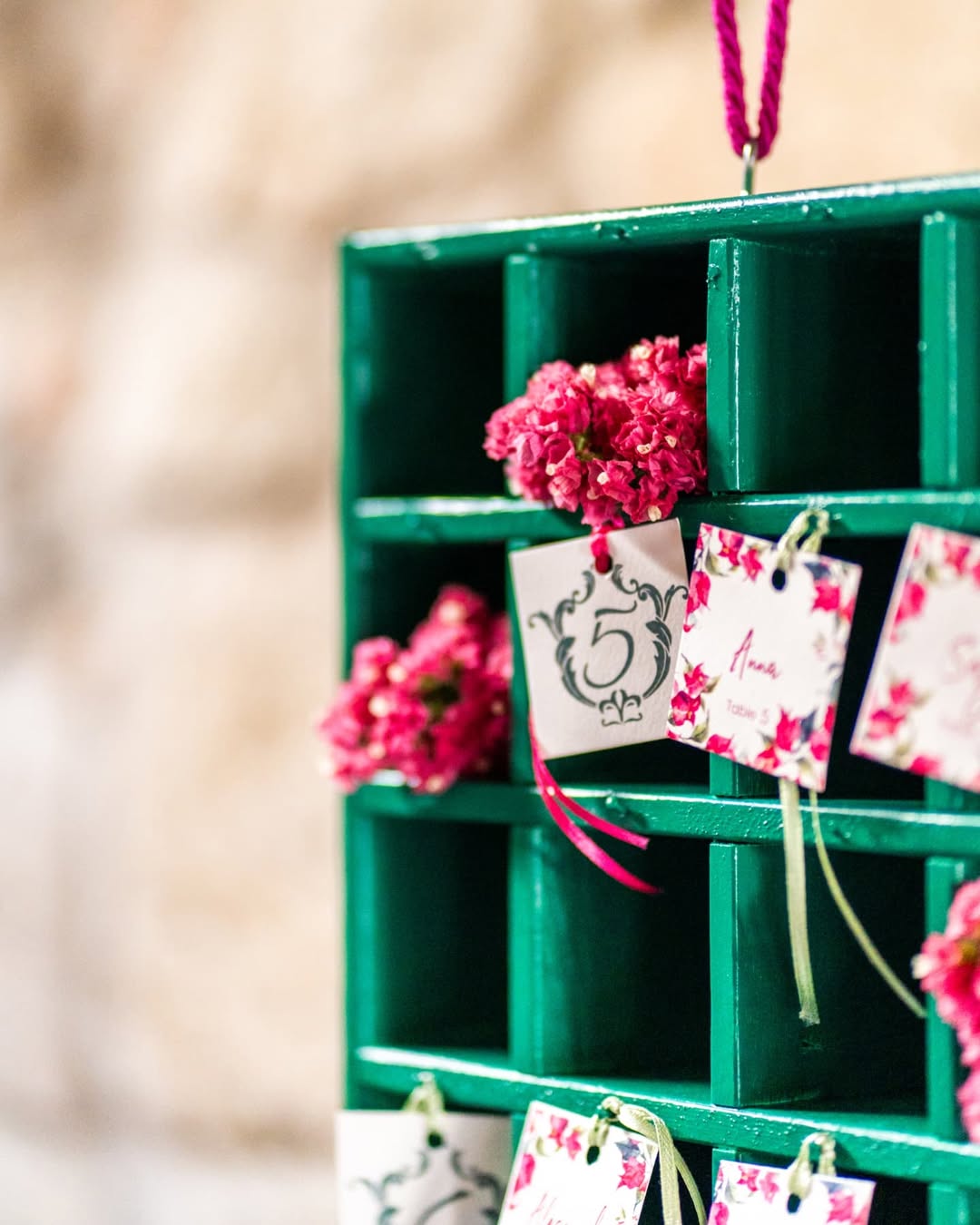 Profumo di primavera per festeggiare Bianca. Verve e tanto carattere contraddistinguono questo party. Colori decisi, profumi inebrianti e tanto charme. Un mix perfetto per raccontare la personalità della festeggiata e dare un’impronta indelebile all’evento. Un evento dove il colore è il protagonista, in un gioco di luci e colori che trasforma la location. Luci nei toni del fucsia per avvolgere le arcate in pietra del portico per una versione più accattivante e calda dell’ambiente. Centrotavola che inneggiano alla primavera con fiori dai colori sgargianti e festosi. Il tableau, una bacheca color ottanio, per contenere card nominative abbellite anch’esse da fiori stilizzati. Un party frizzante curato nei minimi dettagli come solo Mai dire Mai sa fare.